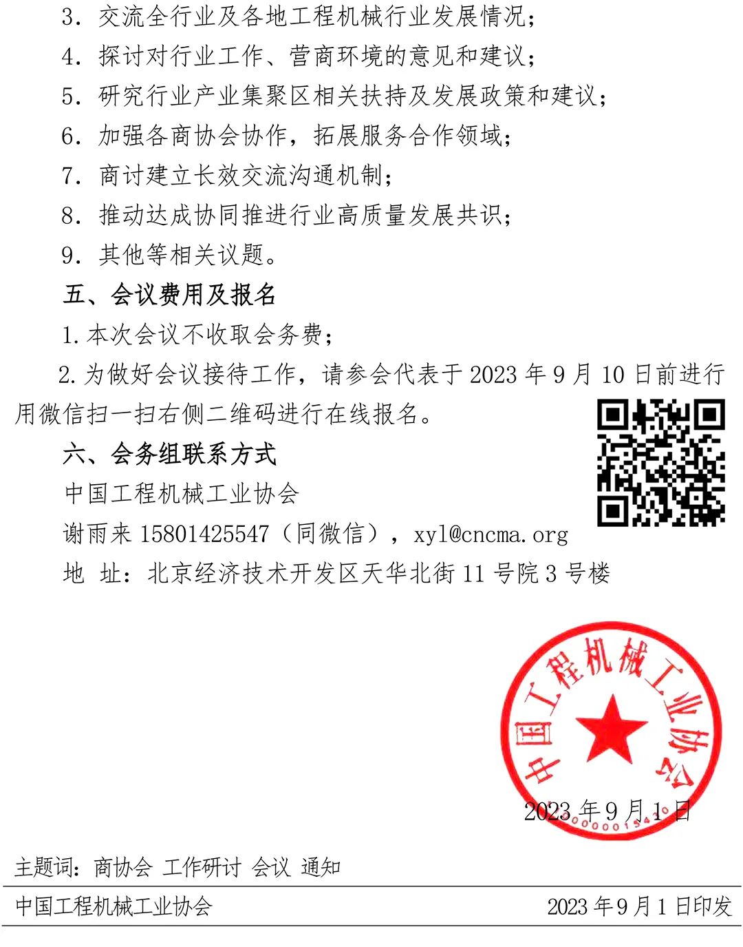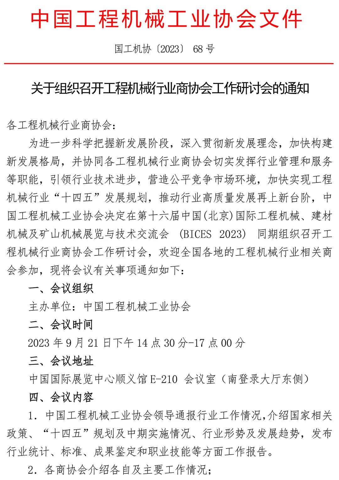 为进一步科学把握新发展阶段,深入贯彻新发展理念,加快构建新发展格局,并协同各工程机械行业商协会切实发挥行业管理和服务等职能,引领行业技术进步,营造公平竞争市场环境,加快实现工程机械行业“十四五”发展规划,推动行业高质量发展再上新台阶,中国工程机械工业协会决定在第十六届中国(北京)国际工程机械、建材机械及矿山机械展览与技术交流会 (BICES 2023) 同期组织召开工程机械行业商协会工作研讨会,欢迎全国各地的工程机械行业相关商协会参加,现将会议有关事项通知如下: