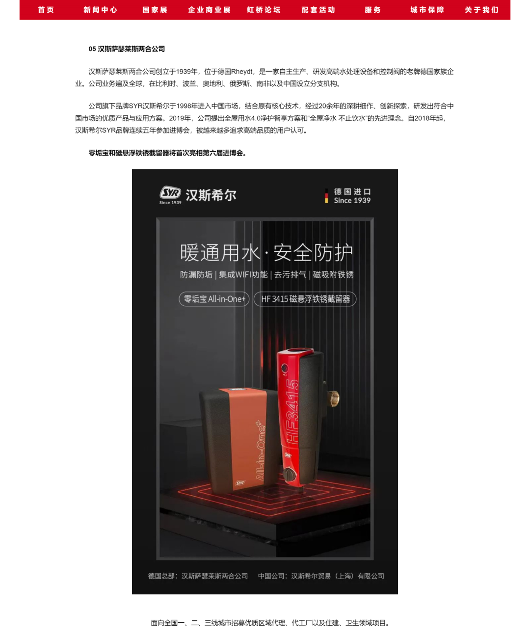 在近期官网发布的消费品展区绿色智能家电及家居第1期中详细介绍了SYR汉斯希尔的品牌历史和本届进博会即将亮相的重磅新品。