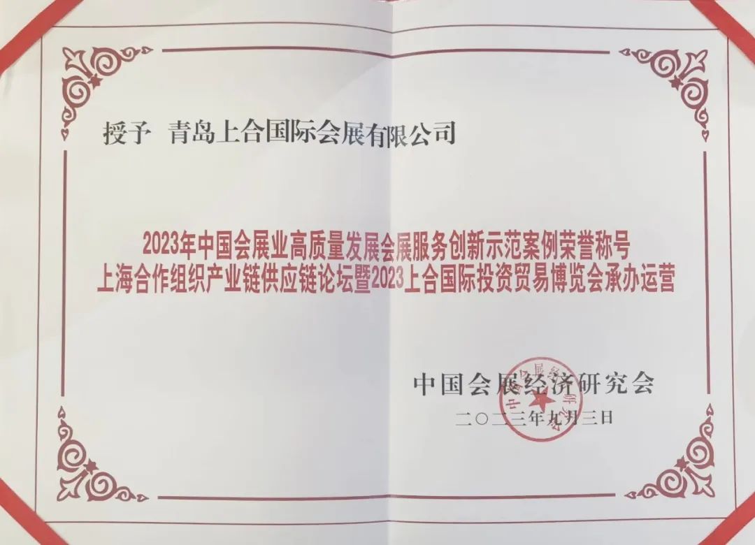 上合控股文旅集团旗下青岛上合国际会展有限公司荣获2023年中国会展业高质量发展会展服务创新示范案例荣誉称号,这是对青岛上合国际会展公司在推动中国会展业高质量发展和创新服务方面的充分肯定。作为上海合作组织产业链供应链暨2023上合国际投资贸易博览会的承办运营单位,青岛上合国际会展公司将继续充分发挥自身优势,为展会提供优质、高效的服务。这一荣誉的获得,将进一步提升上合国际会展在行业内的影响力和竞争力,为推动中国会展业的发展做出更大贡献。