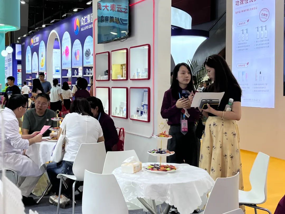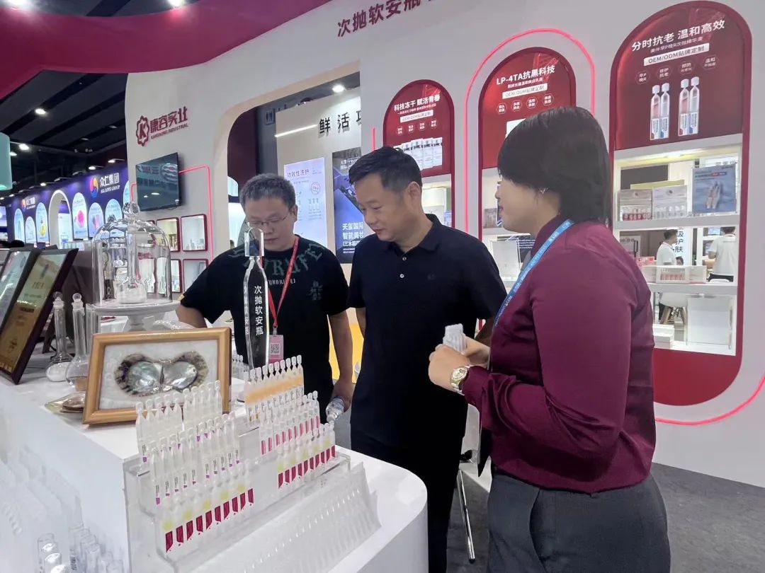 ①玻色因鎏金抗老系列:添加5%玻色因粉末,修护基底膜带,促进IV&VII型胶原蛋白新生,改善皱纹。②3A超能抗衰系列:三种温和A醇协同增效,0.1%浓度也能实现温和减龄。③黑瓷力多肽抗皱系列:专研251多肽法则,实现肌表抗击纹路,中层改善松弛,肌底嘭弹充盈。④珍珠胶原肽智能调控系列:珍稀中国海洋成分,多种问题肌肤靶点击破,焕白亮肌/提拉紧致/弹润滋养/维稳修护越来越多的消费者晋级“成分党”、“功效党”,成分背后实际是消费者对功能功效的需求,消费者需要“成分”的本质,往往是要解决某种具体护肤痛点。康容关注不同细分赛道,精准洞悉消费者细护肤需求,不断推陈出新,助力品牌多元化产品梯次构建。康容作为美业领域的风向标之一,入驻展馆2.1 E02A展位,开展首日便收获超高人气。下面,一起来感受下美博会首日康容展位的盛况吧!