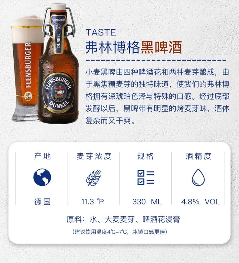 经过冰川水、有机麦芽以及经过精心工艺制作的啤酒花,弗伦斯堡黑啤酒的口感饱满、柔和,并表现出入口绵甜、品位高贵的特点。