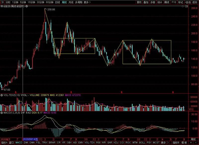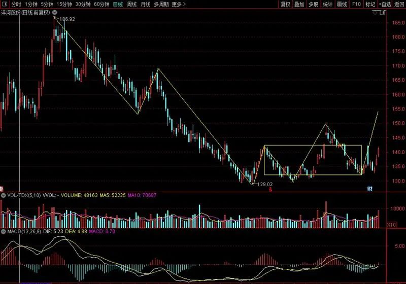 这里最值得一提的就是洋河股份,周线级别,一个盘整下跌,然后再形成一个周线级别中枢,看起来像是上涨趋势的,并且目前处在中枢下沿附近,盈亏比相当划算,看了直流口水!