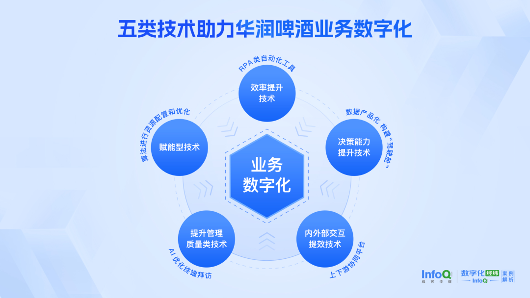 第一类是提升效率的技术,首先要审视业务的标准化程度以及业务发生的频率和概率,从中选择高频且大量可复制的场景,再去应用相应的技术工具或数字化手段。比如,在共享业务中,华润会广泛使用 RPA(Robotic Process Automation)或自动化机器人来优化流程。这种方式是将业务标准化,然后通过自动化替代人力,从而降低人工参与、提高准确性和及时性。第二类是赋能型的技术。以供应链为例,通过应用算法来平衡现有需求和供应之间的关系,当前华润啤酒的供应链计划和仓网规划都运用了大量的计算逻辑和算法来进行资源配置和优化。郭华表示,这一类技术本质上是解决一些结构性难题,比如调整业务的分工合作、优化流程,以及在组织层面培养一些中心化的能力。第三类技术主要关注于提升业务团队的管理质量,使其更准确、可量化和精准。华润啤酒会在终端拜访环节应用 AI 技术,一方面提升了访销效率,另一方面获取了终端客户的信息以及竞品信息,同时也可以进一步确保业务团队在终端操作方面更为准确。另外这类技术的应用场景还有产品追溯,华润开展了白酒“五码关联”、啤酒“三码关联”等举措。第四类技术主要侧重于企业内外部的交互,增强上下游合作并应对各种边际问题,比如沟通效率的提升、信息共享,传递品牌能力等。具体而言,华润啤酒做的供应商协同平台、经销商大客户平台、三级会员体系以及消费者运营 CDP(客户数据平台),这些应用的目标都是为了解决企业与外部相关方之间的合作难题,提升大客户的能力,为其提供专业培训,将终端操作规范化为标准操作流程(SOP)并以工具固化等等。最后一类技术解决的则是企业决策能力和决策质量的问题。以提升数据质量和加强数据应用为例,将不同类型的数据产品化,构建各种“驾驶舱”,将数据能力嵌入业务决策中,从而提升市场判断、业务感知和执行策略的准确性。具体场景包括终端和经销商费用配置的精益化分析,还有消费者运营中的标签构建和群体划分等,这些都需要大量的数据分析和决策支持。“总的来说,一些大家比较耳熟能详的数据中台,在数据层面用的追溯技术、图像识别等,以及一些与国家战略相关的信创技术,在上述五个方面都会涉及到。”郭华总结道。面对不同作用、不同类型的技术,如何将其应用到业务当中的各个关键环节?与上文所述的核心逻辑一致,在华润啤酒数字化的进程里,技术的应用路径还是跟业务的状态和阶段紧密相关,先解决系统整合问题,然后解决经营管理、资源配置和决策支持等问题,以适应业务的不同发展阶段。以生产环节为例,第一阶段技术主要解决管理上的整合问题,通过标准化来提高效率。华润啤酒原来有 98 家工厂,经过产能优化后还有 63 家。但这 63 家工厂一开始并没有按统一的标准进行管理,导致工厂之间的可比成本和质量一致性难以做横向的对标。