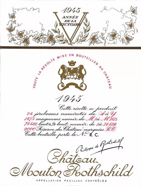 因为各种原因,艺术酒标直到1945年二战结束艺术标项目才再次启动。为庆祝和平的回归,酒庄邀请青年艺术家菲利普·朱利安(Philippe Jullian),绘制了主体图案为象征胜利的字母“V”,两侧缀有象征和平的橄榄枝和葡萄藤蔓,简洁而经典。