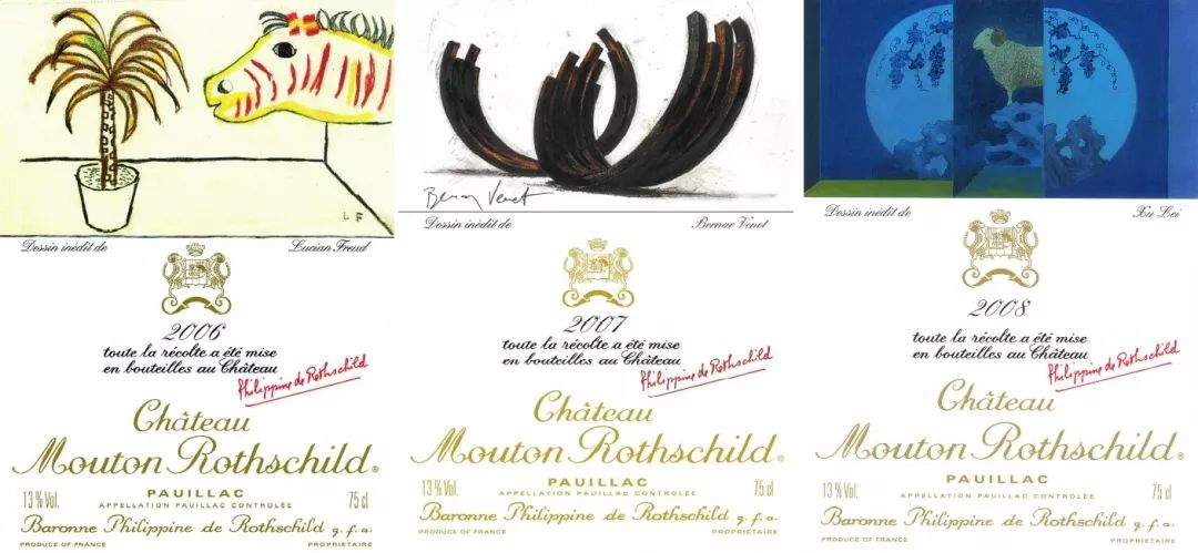 从此以后,木桐酒庄每年都会邀请一位艺术大师来绘制酒标。70多年 过去了,不乏艺术大师,包括毕加索(Picasso)、萨尔瓦多·达利(Salvador Dali)、等等,甚至英国查尔斯王子(HRH Prince Charles)也在列。中国艺术家古干和徐累也在木桐酒标上留下了浓墨重彩的一笔,为其增添一抹中国风的色调。