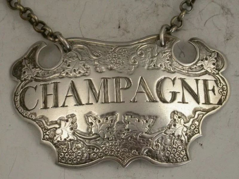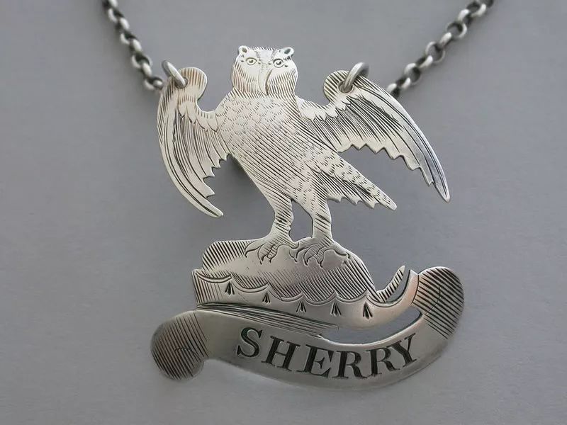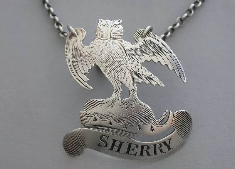 于是葡萄酒需要在上桌前倒入一个干净的醒酒器。为了标明里面装的是什么酒,醒酒器的脖子上就会挂上一个这样的“标签”。它们由银、珐琅,甚至是珍珠母制成,形状和图案各异。