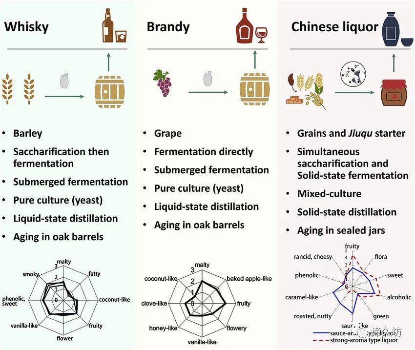 白兰地: 白兰地也经过蒸馏,通常使用锅式蒸馏器,然后在木桶中陈酿。陈酿过程可以持续数年,使白兰地发展出复杂的风味和香气。