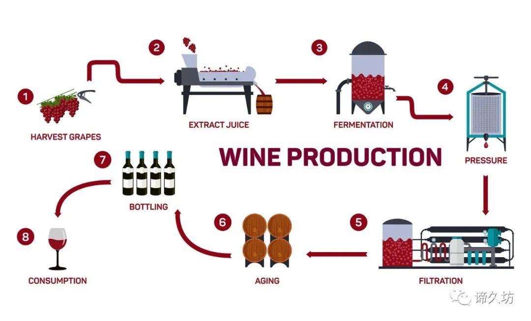 葡萄酒: 葡萄酒不经过蒸馏,而是发酵的产物。发酵过程在持续时间和方式上有差别,从而产出了不同类型的葡萄酒,如红葡萄酒、白葡萄酒、起泡酒和甜酒。