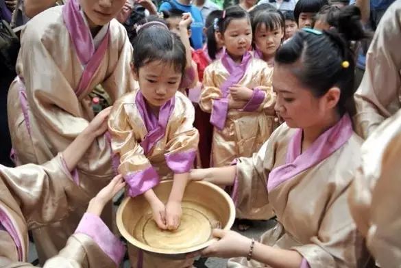 根据《礼记》和《弟子规》而流传下来的“开学仪式”历经千年未改。通常包括正衣冠、行拜师礼、净手净心、开笔礼。