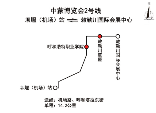 途经站点:坝堰(机场)站、呼和浩特职业学院、敕勒川草原、敕勒川国际会展中心。