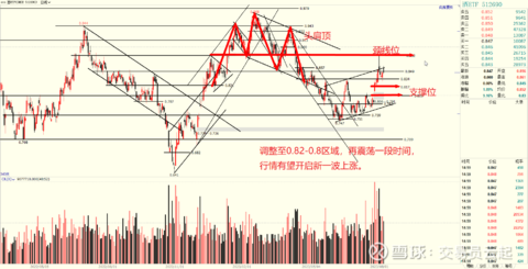 目前(图2),行情受阻于头肩顶颈线位0.882的压力,进入到调整期;再加上此前行情火爆,主力短时利润丰厚,且散户追涨情绪高涨,主力自然不会错过高位减仓的良机;待调整到位,散户在低位止损卖出,主力便会趁机吸筹,再开启新一波攻势。