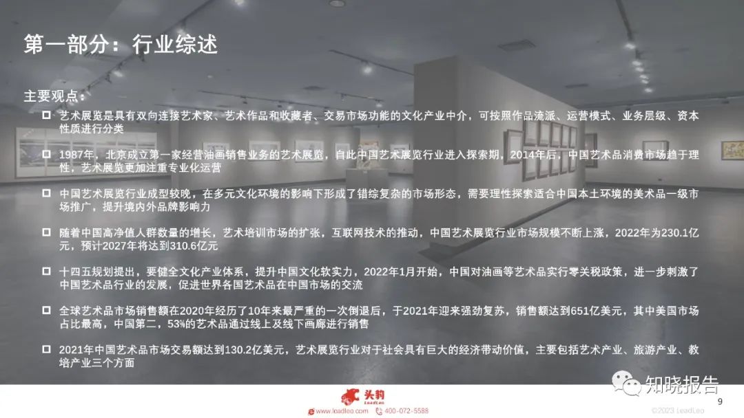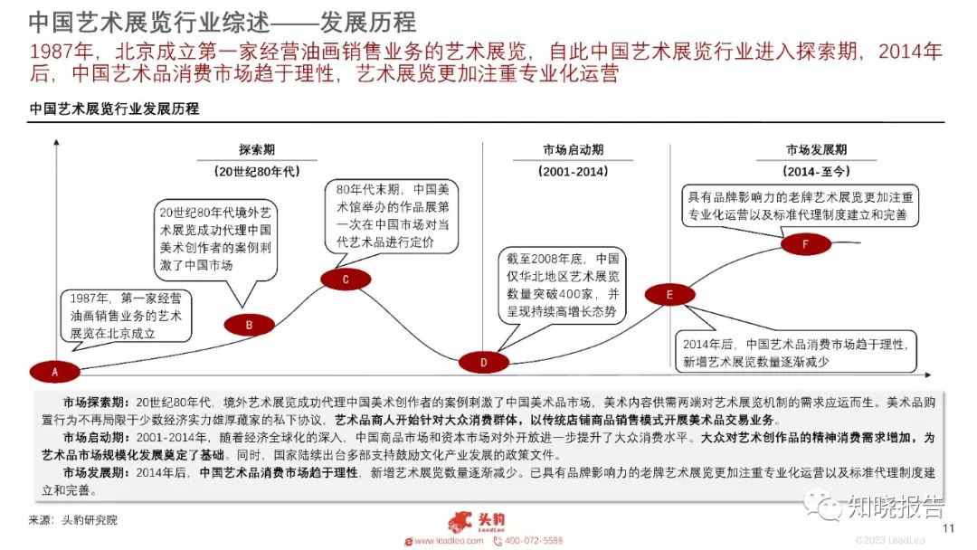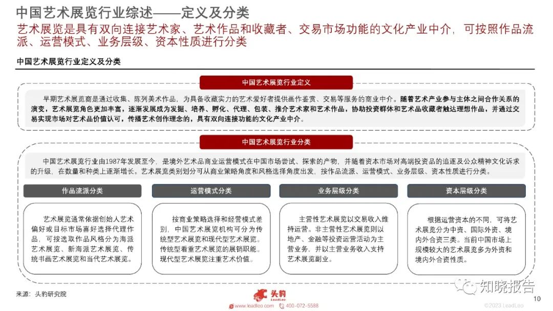 艺术展览是具有双向连接艺术家、艺术作品和收藏者、交易市场功能的文化产业中介,可按照作品流派、运营模式、业务层级、资本性质进行分类。1987年,北京成立第一家经营油画销售业务的艺术展览,自此中国艺术展览行业进入探索期,2014年后,中国艺术品消费市场趋于理性,艺术展览更加注重专业化运营。