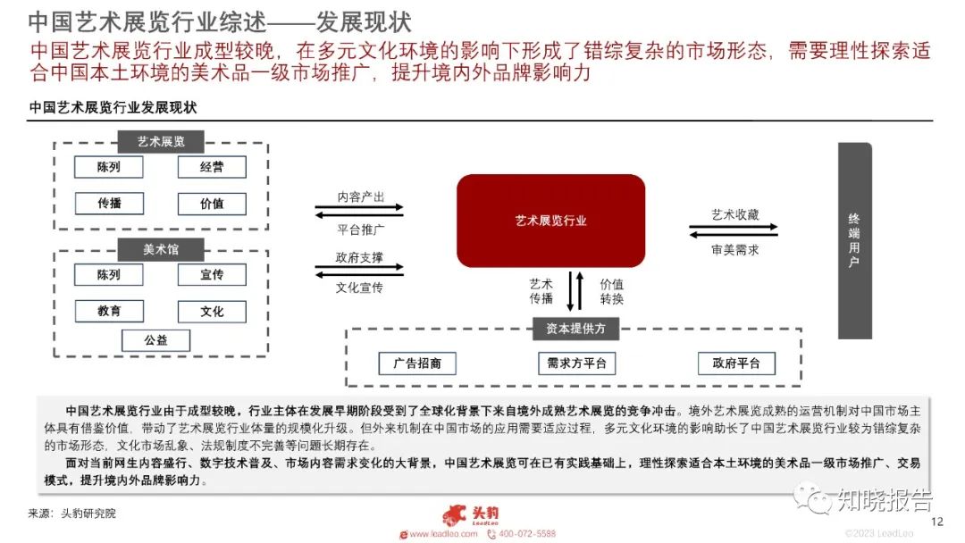 市场现状:中国艺术展览行业成型较晚,在多元文化环境的影响下形成了错综复杂的市场形态,需要理性探索适合中国本土环境的美术品一级市场推广,提升境内外品牌影响力。