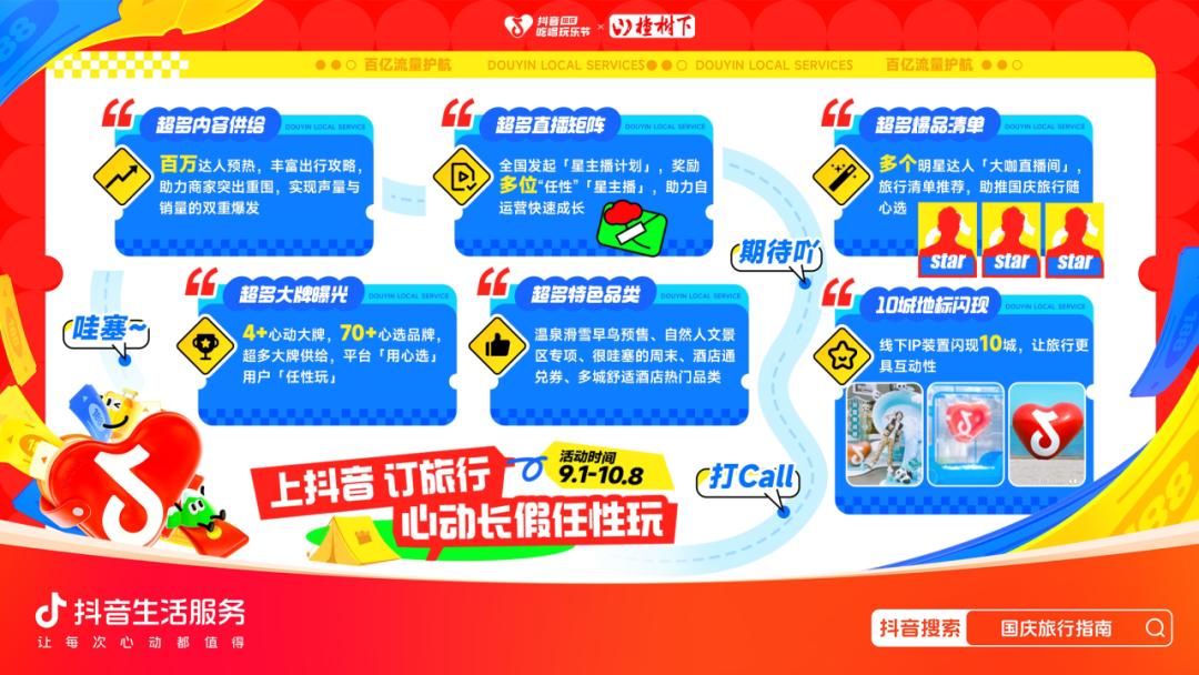 为助力商家获得更大的增量空间,抖音生活服务酒旅行业提前布局国庆节点大促,于9月1日“任性”开启「抖音国庆吃喝玩乐节」,聚焦长线、境外、周边游等出行全场景,锁定家庭、情侣、白领等人群,以内容种草、专场直播、营销事件等多元玩法和资源曝光,向用户传递「上抖音,订旅行,心动长假任性玩」的心智,促进品牌商家实现经营增长。