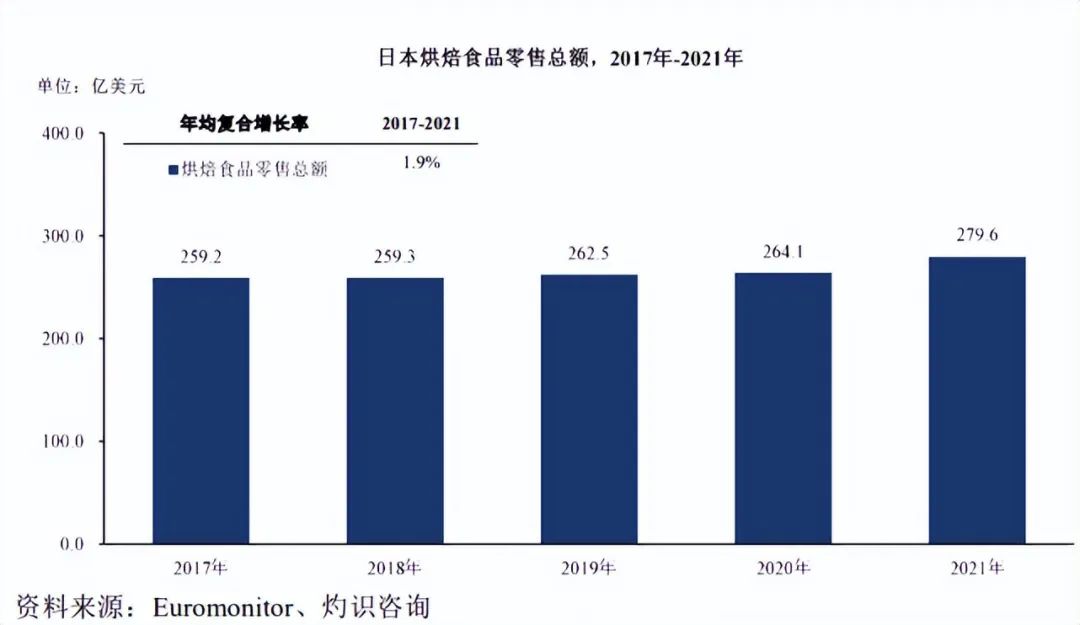 2021 年,随着经济下行相关的影响开始消退,日本的烘焙食品市场逐渐恢复, 整体烘焙食品的消费金额约为 279.6 亿美元,相较于 2020 年增长约 5.9%,2017-2021 年的年均复合增长率约为 1.9%。