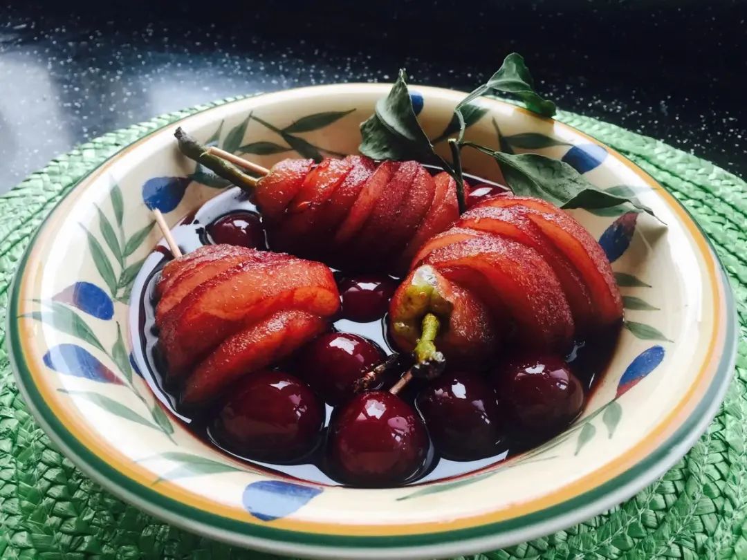 雪梨3只,红酒200ml,冰糖,肉桂,香叶,柠檬片1、将梨(不去皮)用面粉水浸泡,15分钟后洗净待用;2、将清洗干净的雪梨切成片倒入锅中,倒入红酒,加入肉桂、香叶、柠檬片;3、大火煮开后转小火炖煮20分钟,最后5分钟时放入冰糖;4、炖煮期间翻拌雪梨几次,让雪梨充分吸收红酒,开小火将红酒煮开,这一过程不要盖锅盖,以便酒精挥发;5、当梨块煮到完全变红,锅中剩汁不多的时候,马上关火起锅,尽量控制不要熬得太干也不要剩汁过多,我们其实不是喝梨汤而是吃梨,所以熬的只剩一点点汁是刚刚好。红酒有美容养颜的功效,雪梨可以止咳化痰,超级适合现在的季节做下午茶。一份微醺的甜品,再配上一杯红酒,在秋日的温暖阳光里尽享属于自己的时刻。卡门M6西拉,深红的色泽十分诱人。浓郁的胡椒、香草及巧克力的芬芳充盈口腔,伴有浓郁的新鲜蓝莓香味。口感活泼且极具风味,单宁细腻、优雅,酒体平衡后味持久甘甜,余味绵长。不仅适合做菜,还值得你细细品尝!