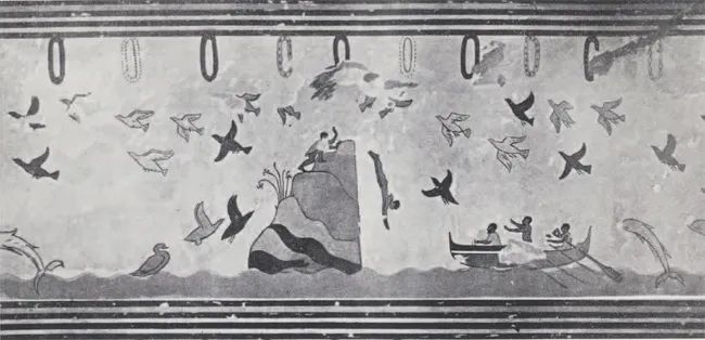 考古学家在亚平宁半岛的塔尔奎尼亚古城遗址中,发现了伊特鲁里亚墓地。该墓地的一处墓室壁画上,清楚地描绘着古代伊特鲁里亚人捕鱼的场景——画中的男孩正从一处高高的岩石上一跃而下,跳入水中。这幅画年代为公元前500年,正值中国的春秋末期。