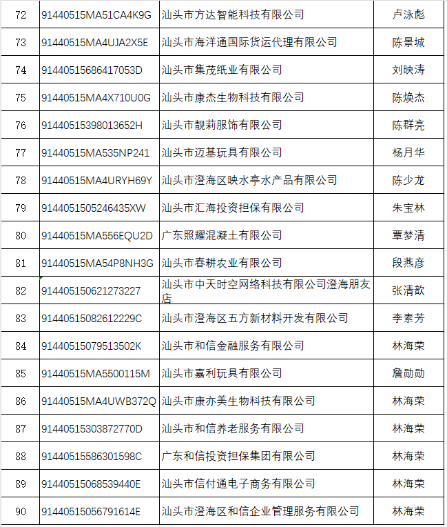 经本局调查,广东基泰玩具实业有限公司、安徽顺联动力快运有限公司澄海分公司等90户公司或分支机构(见附表名单)连续2个年度未依法报送年度报告,也未进行纳税申报,且经所属辖区市场监管所实地核查未发现经营活动,也无法取得联系,属于长期未开展经营活动的企业。根据《中华人民共和国公司法》第二百一十一条第一款的规定,构成自行停业连续六个月以上的违法行为。依照《中华人民共和国公司法》第二百一十一条第一款的规定,拟对上述90户公司或分支机构予以吊销营业执照。