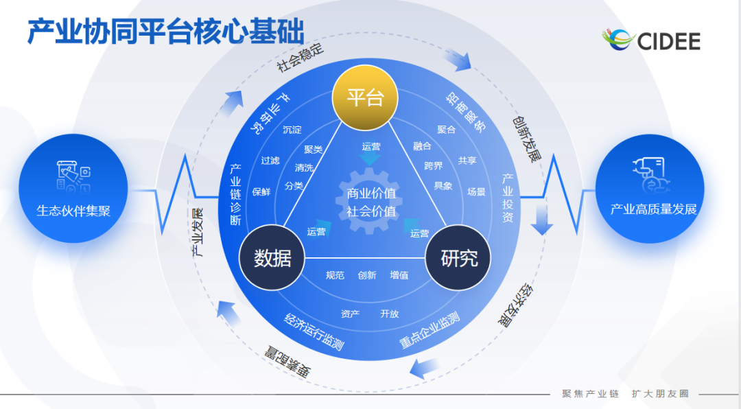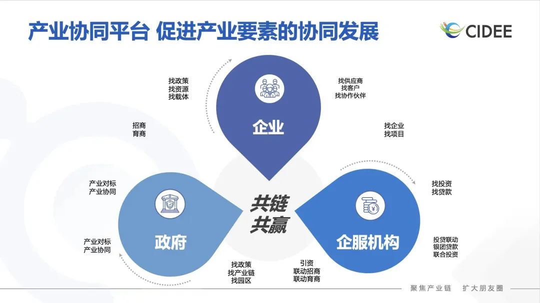 同时,政府、企业、企服机构等产业要素主体,在产业监测、招商育商、营销拓客、政策接收、投贷联动、项目优选等方面存在阻碍,在一定程度上影响着产业数字化转型进程和经济蓬勃发展。以产业协同平台为载体,推进产业要素多方联动,促进产业要素协同发展,被业内看做是推动产业经济高质量发展的一条有效途径。