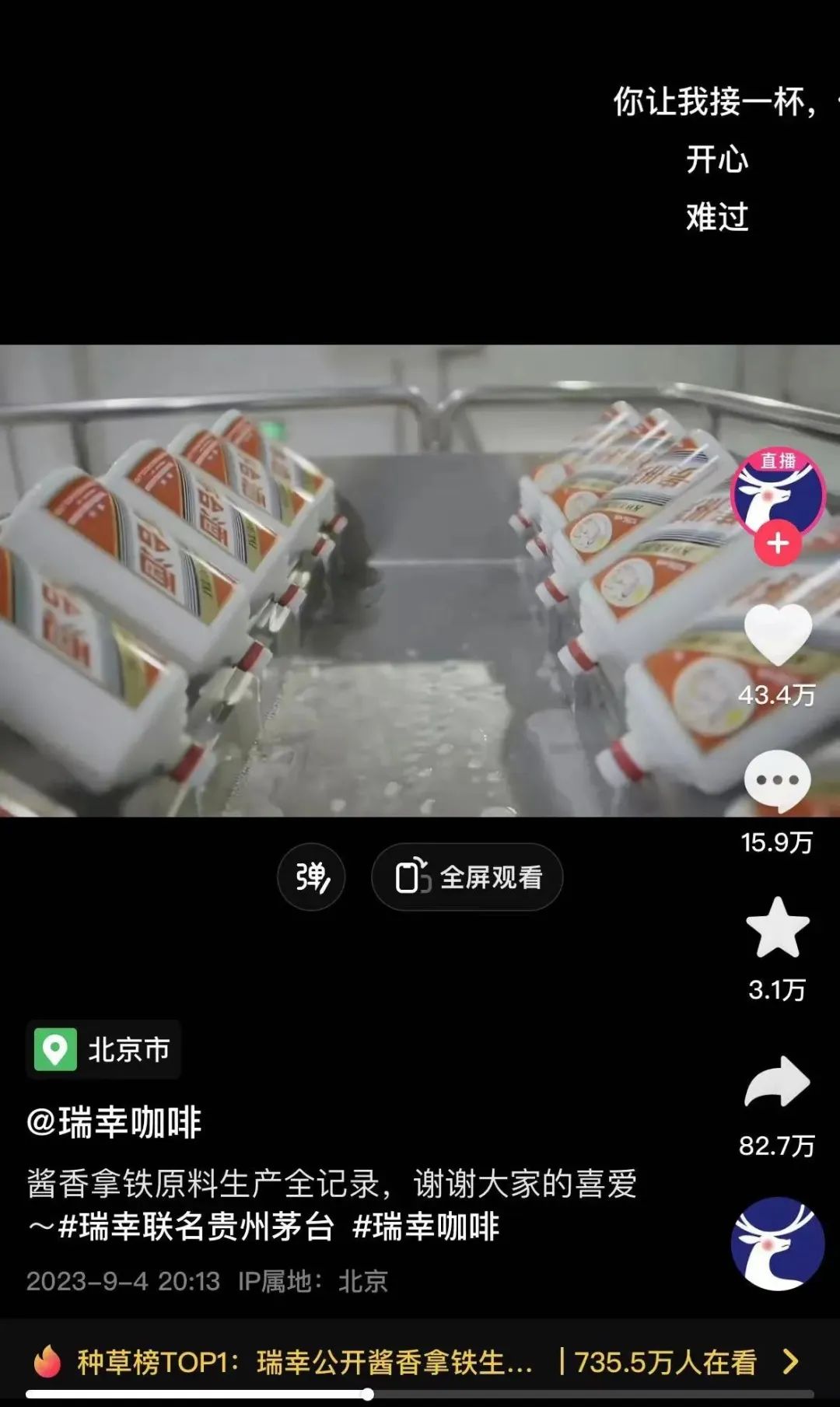 9月4日瑞幸和茅台联名的“酱香拿铁”上市。茅台x瑞幸刷爆朋友圈。咖啡和酒精的碰撞,新奇得直接“炸”掉餐饮界。不仅拿捏住了年轻人,还巧妙得让叔叔阿姨辈都难得“心动”了一回。有人抱怨,早上九点刚开业,想要蹲上一杯“酱香拿铁”都要排号上千。就问问大家一句,你们下单等了多久?"这个周一,最忙碌的一定不是写字楼里的白领,而是楼下的瑞幸咖啡店员工啊!"这一产品被瑞幸称为“年度重磅”,各大社交媒体皆能见到对该产品的讨论和玩梗:“备注:满杯茅台去咖啡液,谢谢!”“又醉又醒”“全款拿下两杯,未来可期”……于是昨晚,@luckincoffee瑞幸咖啡 发布视频“酱香拿铁生产第一线”,展示了酱香拿铁原料生产全记录。