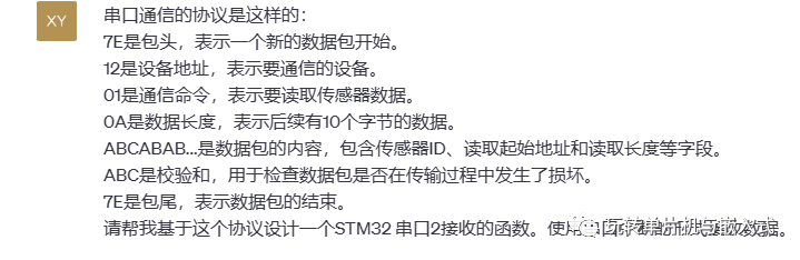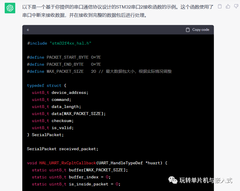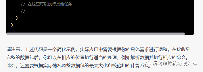 #include "stm32f4xx_hal.h"#define PACKET_START_BYTE 0x7E#define PACKET_END_BYTE 0x7E#define MAX_PACKET_SIZE 20 // 最大数据包大小,根据实际情况调整typedef struct {uint8_t device_address;uint8_t command;uint8_t data_length;uint8_t data[MAX_PACKET_SIZE];uint8_t checksum;uint8_t is_valid;} SerialPacket;SerialPacket received_packet;void HAL_UART_RxCpltCallback(UART_HandleTypeDef *huart) {static uint8_t buffer[MAX_PACKET_SIZE];static uint8_t buffer_index = 0;static uint8_t is_inside_packet = 0;if (huart == &huart2) {if (!is_inside_packet) {if (buffer_index == 0 && received_byte == PACKET_START_BYTE) {is_inside_packet = 1;buffer[buffer_index++] = received_byte;}} else {buffer[buffer_index++] = received_byte;if (buffer_index >= 4) {uint8_t data_length = buffer[3] - 2; // 计算数据区长度(不包括校验和和包尾)if (buffer_index == (data_length + 6)) { // 收到完整的数据包received_packet.device_address = buffer[1];received_packet.command = buffer[2];received_packet.data_length = data_length;for (int i = 0; i < data_length; i++) {received_packet.data[i] = buffer[4 + i];}received_packet.checksum = buffer[data_length + 4];received_packet.is_valid = 1;// 处理接收到的数据包,例如执行相应的命令// ...// 复位接收缓冲区和状态buffer_index = 0;is_inside_packet = 0;}}}HAL_UART_Receive_IT(&huart2, &received_byte, 1); // 启动下一次接收中断}}int main(void) {// 初始化HAL库和串口2HAL_Init();SystemClock_Config();MX_GPIO_Init();MX_USART2_UART_Init();// 启动接收中断HAL_UART_Receive_IT(&huart2, &received_byte, 1);while (1) {// 在这里可以执行其他任务// ...}}