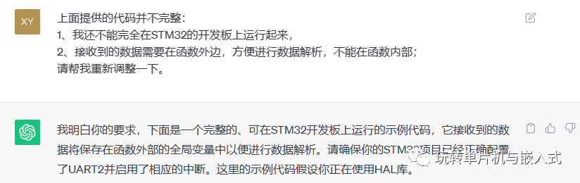 UART_HandleTypeDef huart2;typedef struct {uint8_t device_address;uint8_t command;uint8_t data_length;uint8_t data[MAX_PACKET_SIZE];uint8_t checksum;uint8_t is_valid;} SerialPacket;SerialPacket received_packet;// 接收缓冲区uint8_t rx_buffer[MAX_PACKET_SIZE];uint8_t rx_buffer_index = 0;uint8_t is_inside_packet = 0;void process_received_data() {// 在这里可以解析和处理接收到的数据包// 访问 received_packet 中的数据进行解析// 例如,你可以根据 received_packet.command 执行相应的操作// ...// 清除接收缓冲区,准备接收下一个数据包memset(rx_buffer, 0, sizeof(rx_buffer));rx_buffer_index = 0;is_inside_packet = 0;}void HAL_UART_RxCpltCallback(UART_HandleTypeDef *huart) {if (huart == &huart2) {if (!is_inside_packet) {if (rx_buffer_index == 0 && rx_buffer[0] == PACKET_START_BYTE) {is_inside_packet = 1;}} else {rx_buffer[rx_buffer_index++] = received_byte;if (rx_buffer_index >= 4) {uint8_t data_length = rx_buffer[3] - 2; // 计算数据区长度(不包括校验和和包尾)if (rx_buffer_index == (data_length + 6)) { // 收到完整的数据包received_packet.device_address = rx_buffer[1];received_packet.command = rx_buffer[2];received_packet.data_length = data_length;for (int i = 0; i < data_length; i++) {received_packet.data[i] = rx_buffer[4 + i];}received_packet.checksum = rx_buffer[data_length + 4];received_packet.is_valid = 1;process_received_data(); // 处理接收到的数据包// 启动下一次接收中断HAL_UART_Receive_IT(&huart2, rx_buffer, 1);}}}}}int main(void) {// 初始化HAL库和串口2HAL_Init();SystemClock_Config();MX_GPIO_Init();MX_USART2_UART_Init();// 启动接收中断HAL_UART_Receive_IT(&huart2, rx_buffer, 1);while (1) {// 在这里可以执行其他任务// ...}}