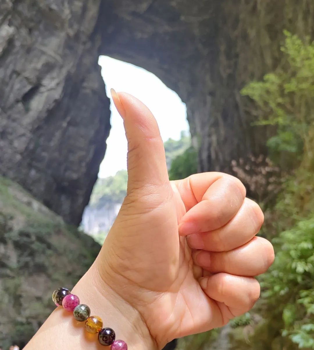 从某个角度看,又像弯曲的左手大拇指,因此,有游客会将自己的左手大拇指弯曲,“嵌”进石缝来自拍自己的大拇指,形成有趣的画面。