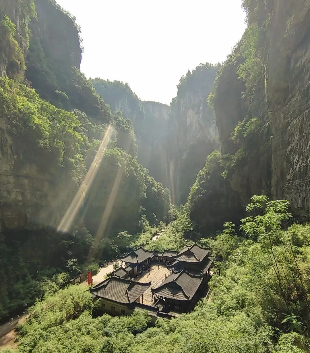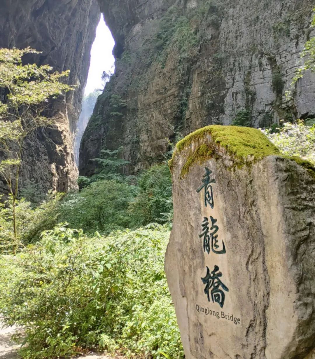 前面提到“天生三桥,是由天龙桥、青龙桥、黑龙桥组成”,其中值得一提的是青龙桥,远远看两边“桥墩”围成的石缝,天光从这石缝中透出来,很像是关公的青龙偃月刀,刀身还闪著金光。