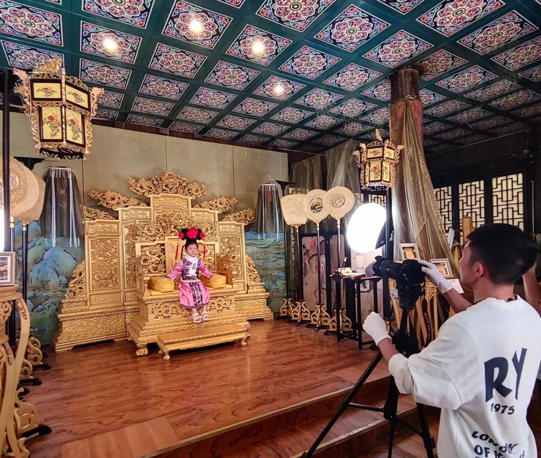 在“天福官驿”内,除了两边是卖纪念品的小摊,还有可装扮皇帝后妃拍照过把瘾的地方。