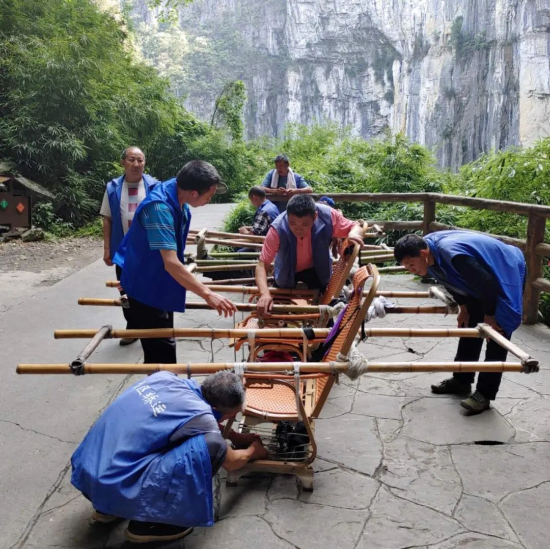 在重庆几个旅游景点,多会有一种很特别的“交通工具”,就是滑竿。
