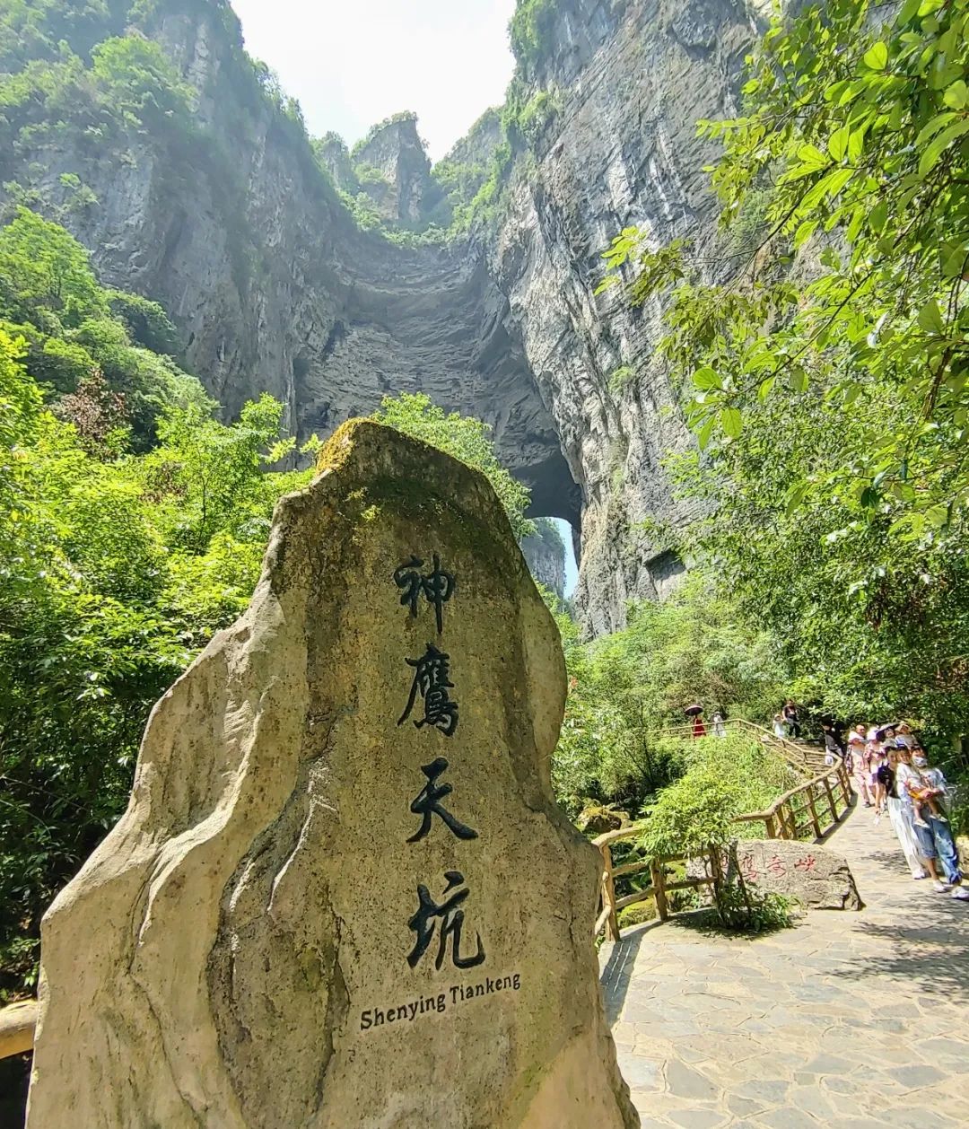 另外,前面也提到“青龙天坑、神鹰天坑两个天坑”,其中的神鹰天坑很有趣,你从石碑处抬头往上看,凸出来的岩石很像老鹰的头,因此叫神鹰。