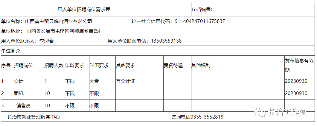 长治招聘||山西省屯留县麟山酒业有限公司招聘