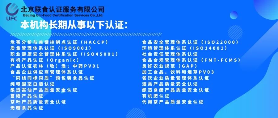 北京联食认证服务有限公司是食品伙伴网旗下、经国家认证认可监督管理委员会批准的第三方独立认证机构(批准号:CNCA-R-2020-681),批准业务范围:ISO 9001质量管理体系、ISO 22000食品安全管理体系、HACCP危害分析和关键控制点体系、有机产品认证、良好农业规范(GAP)认证、食品合规管理体系认证、农林(牧)渔;中药、加工食品、饮料和烟草、纯粮固态白酒认证、无糖食品认证、社会责任管理体系认证。