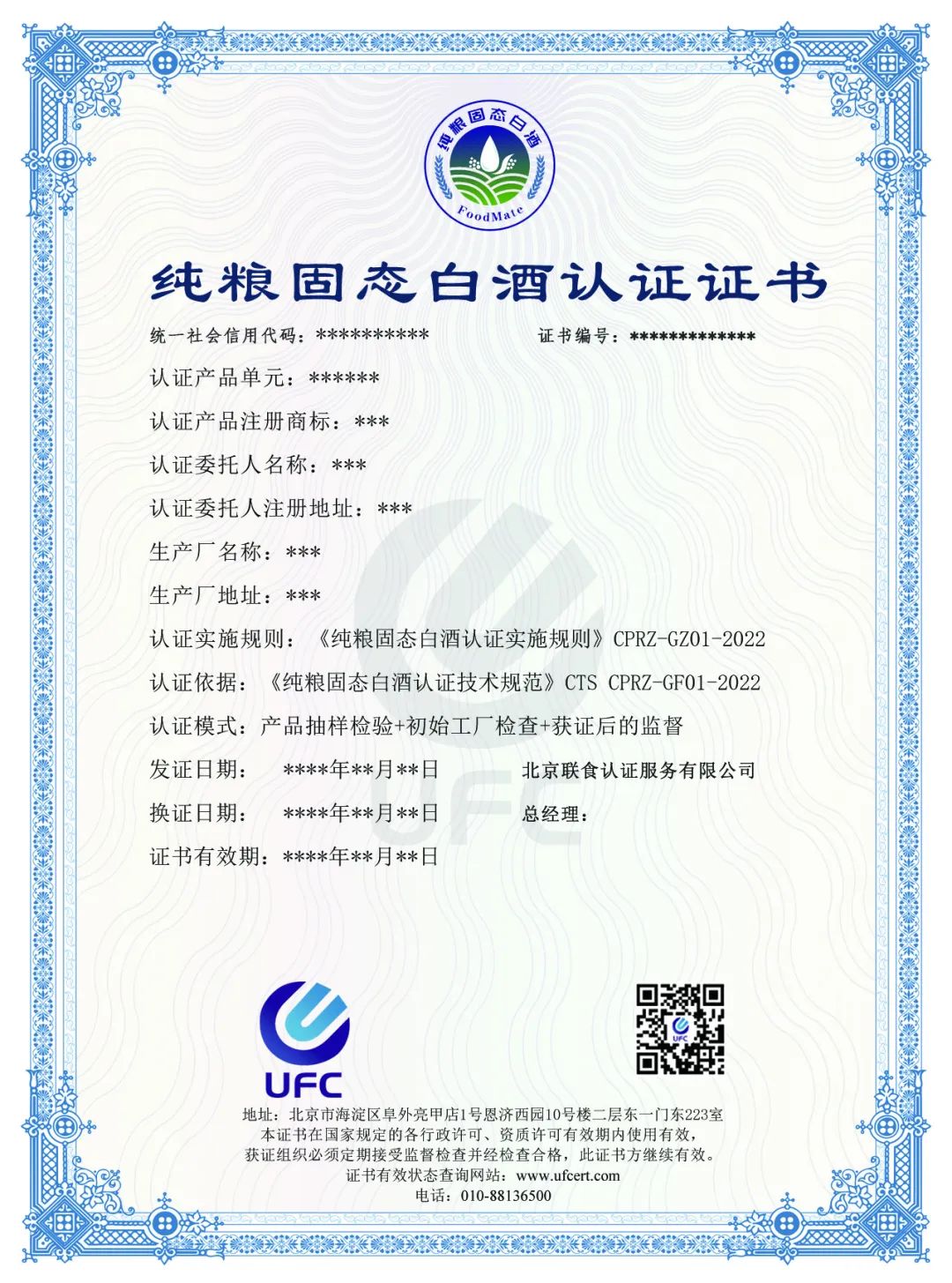 由于白酒国家标准的变化,白酒企业产品结构面临转型升级,产品包装需要更新换代。加上目前很多企业苦于不能将产品质量安全信息和特色信息有效传递给社会和消费者,产品宣传无处发力。白酒企业需要有第三方专业机构为其背书,帮助其增强产品信誉和品牌影响力。为了适应产品发展要求,适应企业提升要求,适应产业升级要求,联食认证于2022年2月率先推出白酒高端品质认证“纯粮固态白酒认证”。目前已有陕西柳林酒业集团有限公司、山东景芝白酒有限公司、黑龙江省玉泉酒业有限责任公司、江苏分金亭酒业有限公司、鄂尔多斯市王道酒业有限公司、四川邛崃金六福崖谷生态酿酒有限公司、山东扳倒井股份有限公司、陕西国粹凤香酿酒有限公司、新疆昆仑特酒业股份有限公司、吉林省洮儿河酒业有限公司等多家规模白酒生产企业产品获得纯粮固态白酒认证。