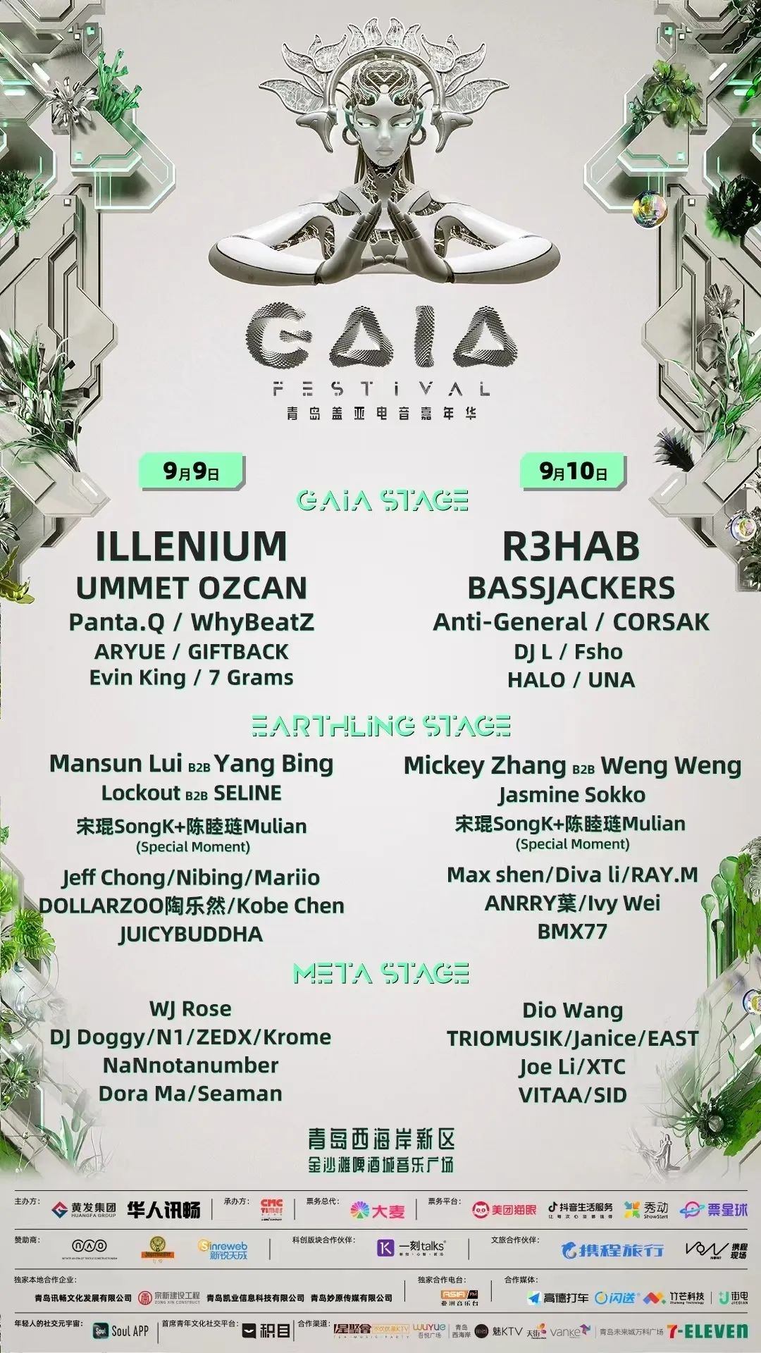 GAIA FEST青岛盖亚电音嘉年华,是主打娱乐科创主题的国际电音嘉年华。由青岛黄岛发展(集团)有限公司与青岛华人讯畅文化传播有限公司联合主办。三大舞台汇聚40多组海内外艺人,将在两天内轮番上演电音盛宴。