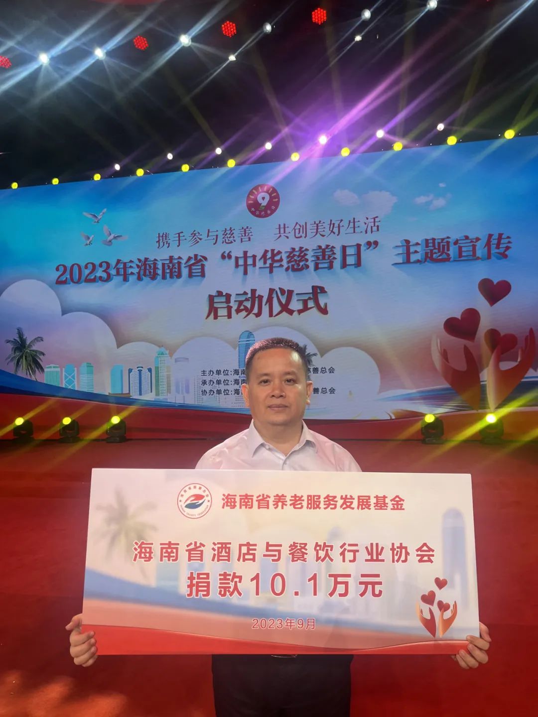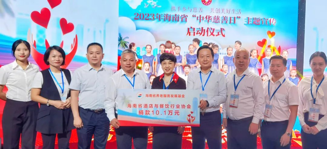 海南省酒店与餐饮行业协会20000元、海南拾味馆餐饮连锁管理有限公司50000元、海南龙泉集团有限公司6000元、海南皇马假日酒店管理集团有限公司5000元、海南十八碗餐饮文化管理有限公司5000元、海南川妹餐饮管理服务有限公司5000元、海南豪约客餐饮管理有限公司5000元和海口锦晟酒店管理有限公司5000元,八家单位在仪式上为养老服务发展基金共捐款:拾万壹仟元。