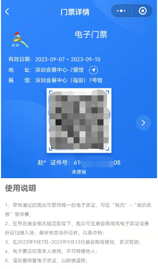 ⑤通过“文博会”公众号【票证大厅】->【门票查询】,或授权登录“文博会+”小程序后在【我的】->【我的票券】中查看到电子门票
