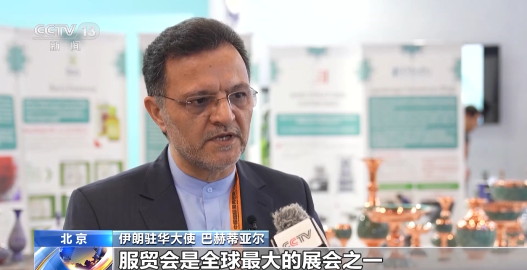 伊朗驻华大使巴赫蒂亚尔:服贸会是全球最大的展会之一,服贸会主要向民众提供服务,各个领域具有提供高质量服务能力的企业,参加服贸会向人们展示自己的产品和服务。伊朗也在此次服贸会上设立了国家馆,向中国人民介绍伊朗手工艺品、特色高质量产品等,我希望这些都能得到中国人民的喜爱。
