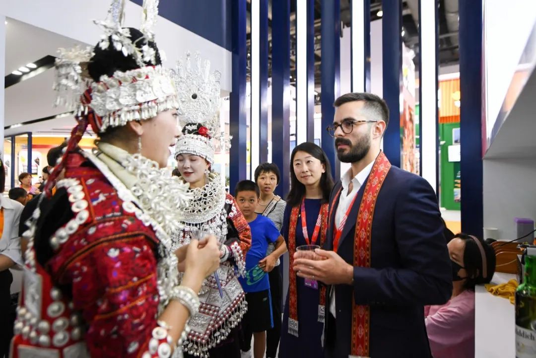 9月3日,在服贸会国家会议中心综合展区的英国展馆,来自贵州省黔东南州的演员与英国展馆工作人员(前右一)交流。(图片来源:新华社)