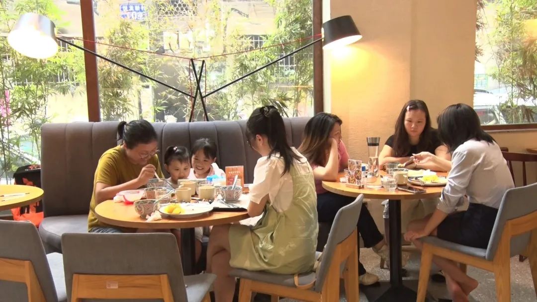 市民说:“暑假的早上一般会让小朋友先看看书,然后带她们出来吃早餐,再去公园玩。暑假经常出来吃饭,我感觉这个暑假特别多人出来吃饭、出来玩,热闹了很多。”
