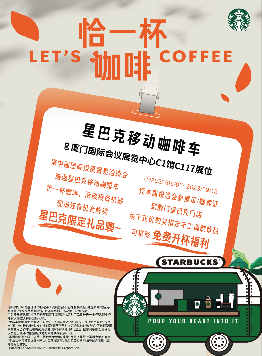 第二十三届中国国际投资贸易洽谈会(简称:投洽会)将于9月8日在厦门盛大举行。作为餐饮配套服务企业,星巴克别出心裁地将移动咖啡小车开进了会展现场。熟悉的美人鱼logo、绿白相间的经典配色、复古萌趣的移动咖啡车一出场,就吸引了众多参会人士驻足打卡,成为了展会现场一道亮丽的风景线。