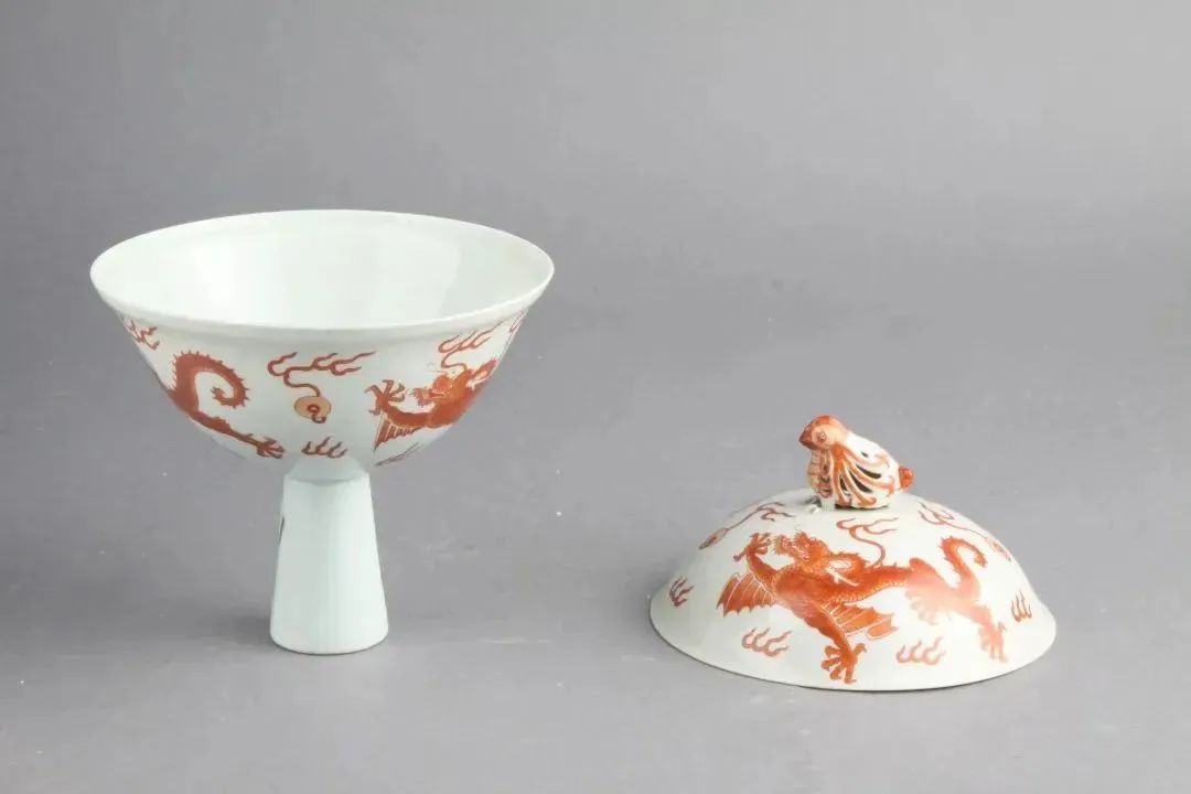 清·乾隆 红彩龙纹天鸡钮高足盖碗