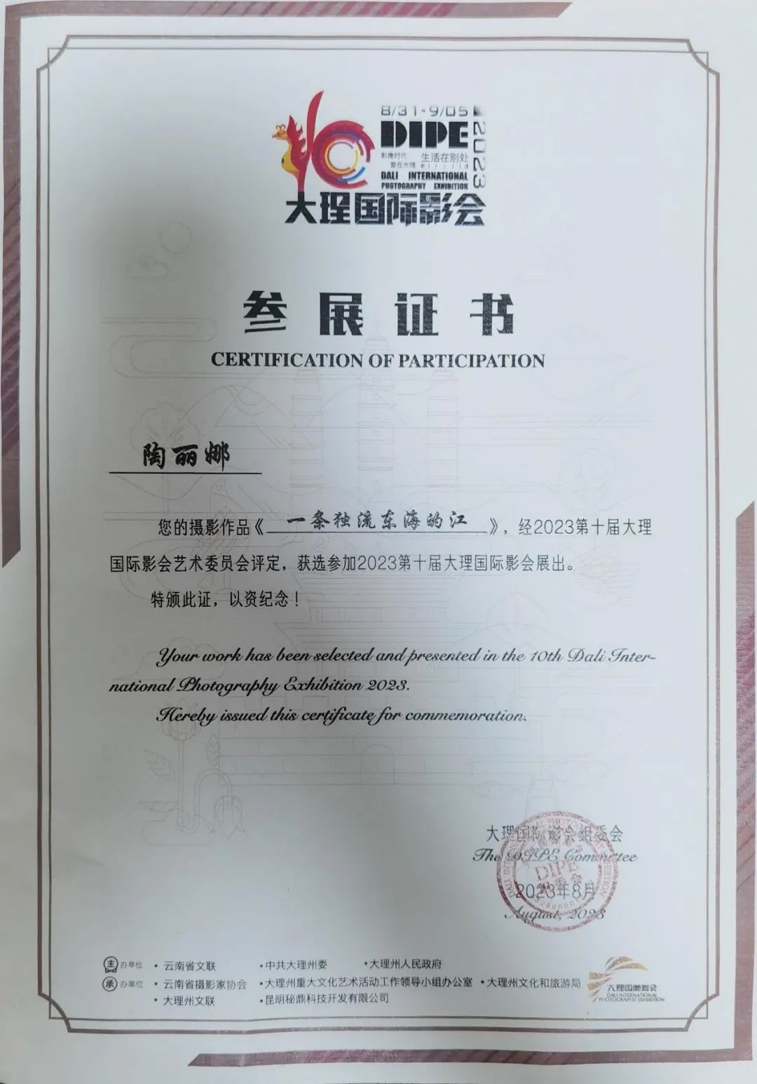 2023年9月5日,2023第十届大理国际影会圆满闭幕。椒江区摄影家协会秘书长陶丽娜摄影作品 《一条独流东海的江》入选此届影会展出。