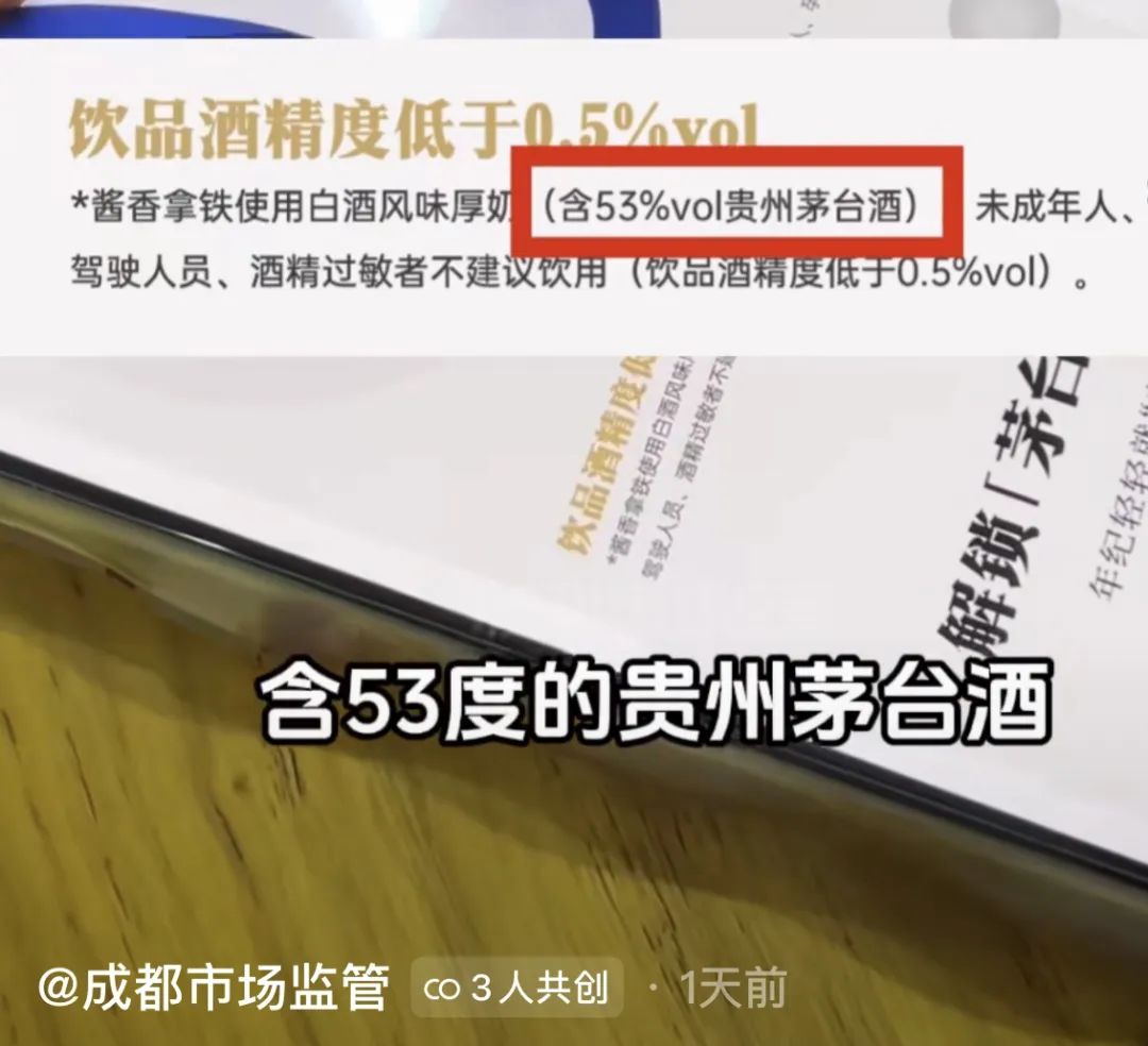 同样的,白酒咖啡含了酒精,在抖音号“成都市场监管局”经过实地检验,得到的反馈是“酱香拿铁”确实含有 53%vol 贵州茅台酒。