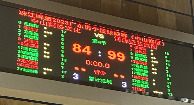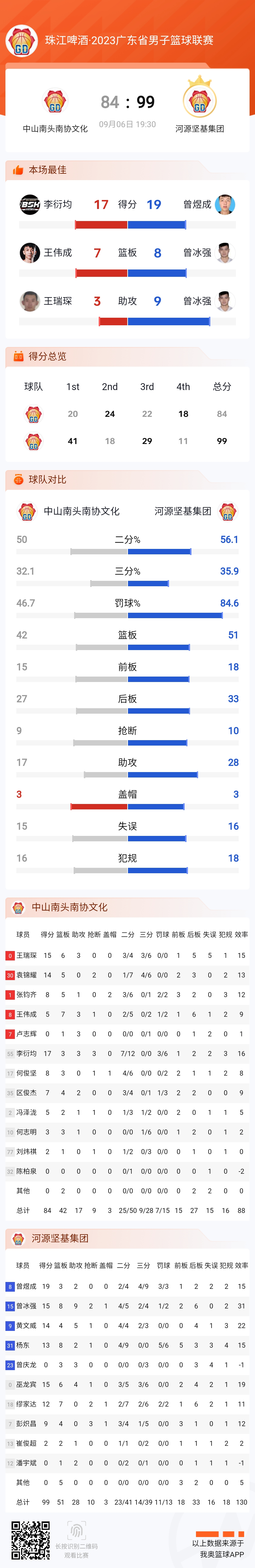末节,河源拥有优势,换上由彭炽昌和潘宇斌领衔的第二阵容得到充足上场时间,中山继续追分。最终比分中山84:99河源,河源拿下季军争夺战首回合主动权。
