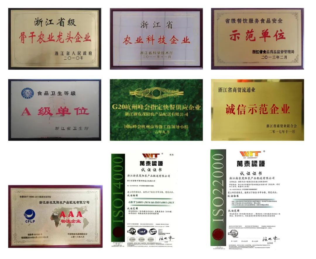 公司有大型冷冻库2个、小型冷冻库10余个、二级冷藏库5个、干货库5个、备品备件库3个、总面积逾13500平方米。各类食材经验收合格后,第一时间进入仓库储存或者冷冻冷藏,从而保证菜品从采购到储存、配送的整条环节都保持新鲜、安全。公司依托浙农控股集团的资源优势,完善产业链的总体布局,实践有效的集采模式,深入拓展农副产品加工及配送环节,定向服务学校、机关、企事业单位等食堂,为农产品从养(种)殖—加工—销售的一体化经营做出成功示范,实践“从田园到餐桌,从种子到筷子”的农业全产业链模式。浙农茂阳拥有行业内顶尖的人才团队、强大的技术支撑和先进的设施设备,形成企业核心竞争力,保障所有的食材从源头到餐桌的安全。公司先后被评为“浙江省级骨干农业龙头企业”、“浙江省农业科技企业”、“浙江省农业企业科技研发中心”、“信用等级AAA级企业”、“省级餐饮服务食品安全示范单位”、“全国AAA物流企业”。 公司通过了HACCP食品安全管理体系认证,ISO9001:2008 和ISO22000质量管理体系认证。获评2017年“浙江省商贸流通业诚信示范企业”,是社会对浙农茂阳公司工作的又一次肯定。想在此推广的团餐公司