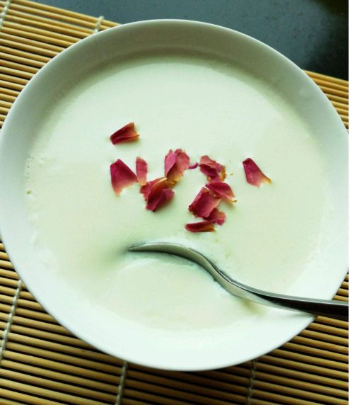 5.牛奶跟姜汁距离一块筷子的高度,倒入姜汁里,形成姜汁撞奶的过程