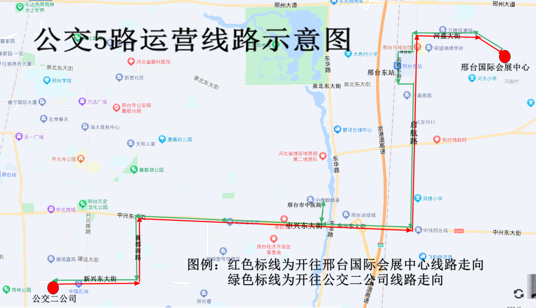 公交5路由公交二公司发车,按原路线行驶至大吕站后,沿启航路(原振兴一路向北)——河盛大街(向东)至终点站邢台国际会展中心。