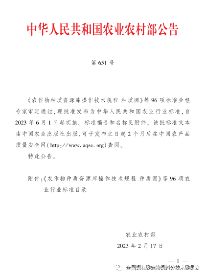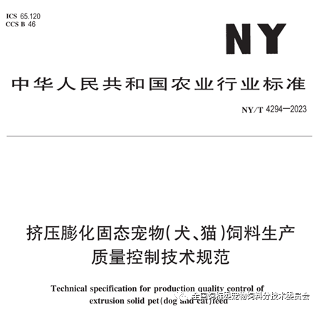 2023年2月17日,中华人民共和国农业农村部公告第651号发布96项农业行业标准,中国农业科学院饲料研究所牵头起草的农业行业标准NYT4294-2023《挤压膨化固态宠物(犬、猫)饲料生产质量控制技术规范》自此正式发布。
