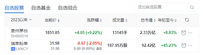 截至目前,贵州茅台市值2.33万亿元人民币,瑞幸咖啡市值92.42亿美元。
